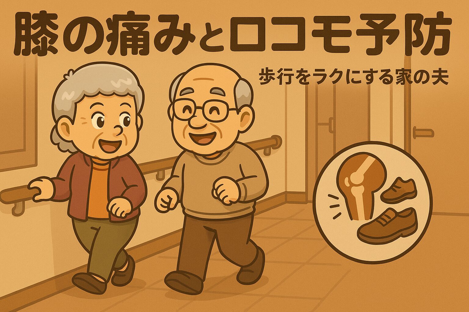 膝の痛みは“年齢のせい”と諦めるより、家の段差・靴・筋トレの三点を少しずつ整えるのが近道や。今日はまず、家のつかむ場所と足元を見直して、椅子スクワット10回から始めよか。外へ一歩出られたら、近所一周の散歩でも十分。やり過ぎないで続ける——これがロコモ予防のいちばんの特効薬やで。